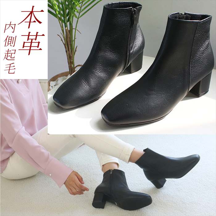 楽天市場 本革 革 ショートブーツ 太ヒール チャンキーヒール レザー ブーティー レディース ブーツ ショート 黒 ブラック スムース 起毛 スクエアトゥ Rilla By Uni